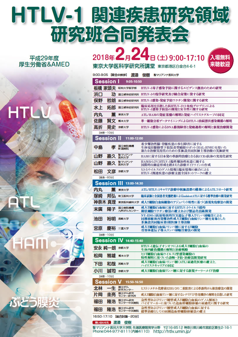 | 主催 | AMED 新興・再興感染症に対する革新的医薬品等開発推進研究事業 「HTLV-1の疫学研究及び総合対策に資する研究」代表:浜口功 AMED 難治性疾患実用化研究事業 「HAMに対する日本発の革新的治療となる抗CCR4抗体の実用化研究」代表:山野嘉久 厚生労働省 がん対策総合推進研究事業 「ATL/HTLV-1キャリア診療中核施設群の構築によるATLコホート研究」代表:内丸薫 厚生労働省 難治性疾患政策研究事業 「HAMならびにHTLV-1陽性難治性疾患に関する国際的な総意形成を踏まえた診療ガイドラインの作成」代表:山野嘉久 厚生労働省 成育疾患克服等次世代育成基盤研究事業 「HTLV-1母子感染予防に関するエビデンス創出のための研究」代表:板橋家頭夫 |